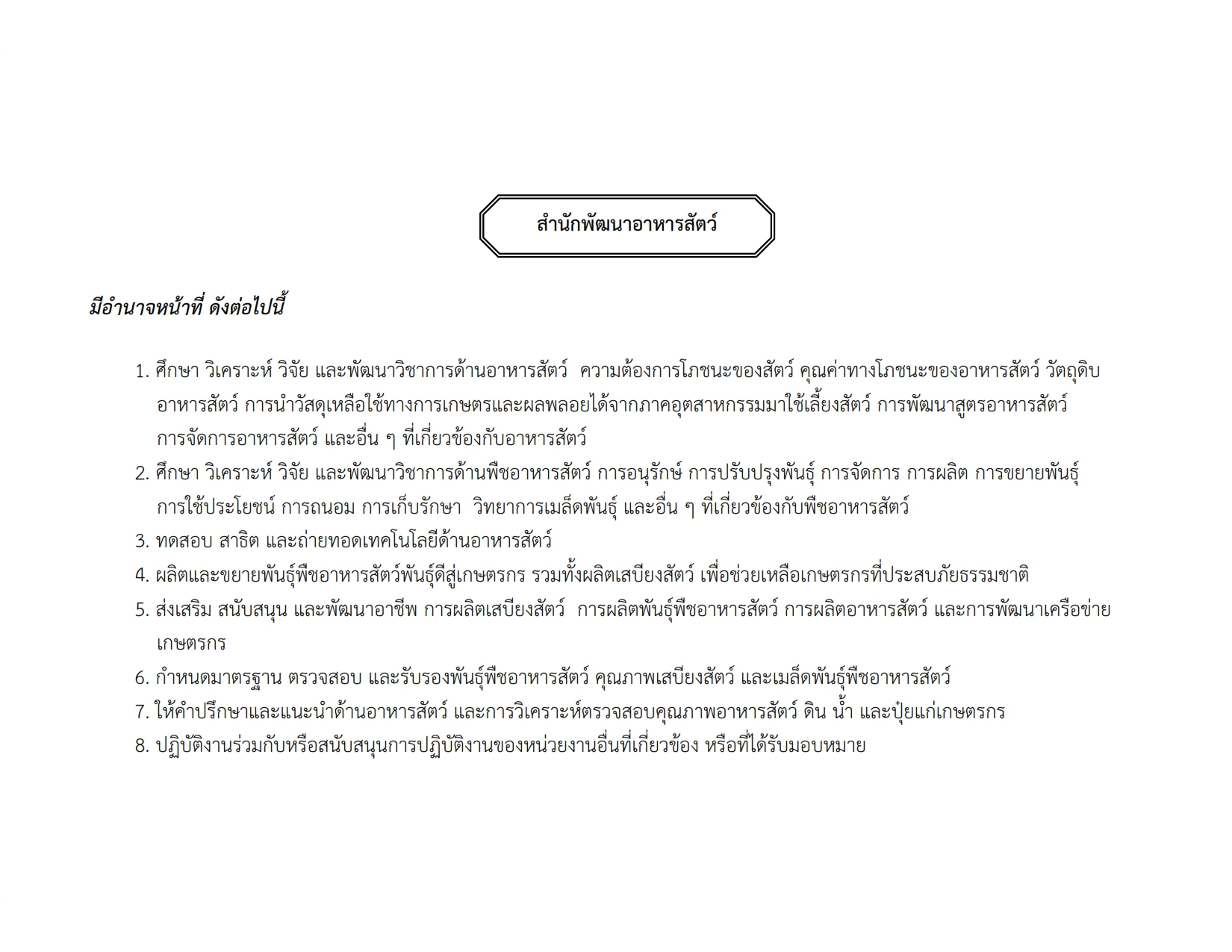 กำหนดให้ สำนักพัฒนาอาหารสัตว์ เป็นหน่วยงานบริหารราชการส่วนกลาง มีอำนาจหน้าที่ดังต่อไปนี้