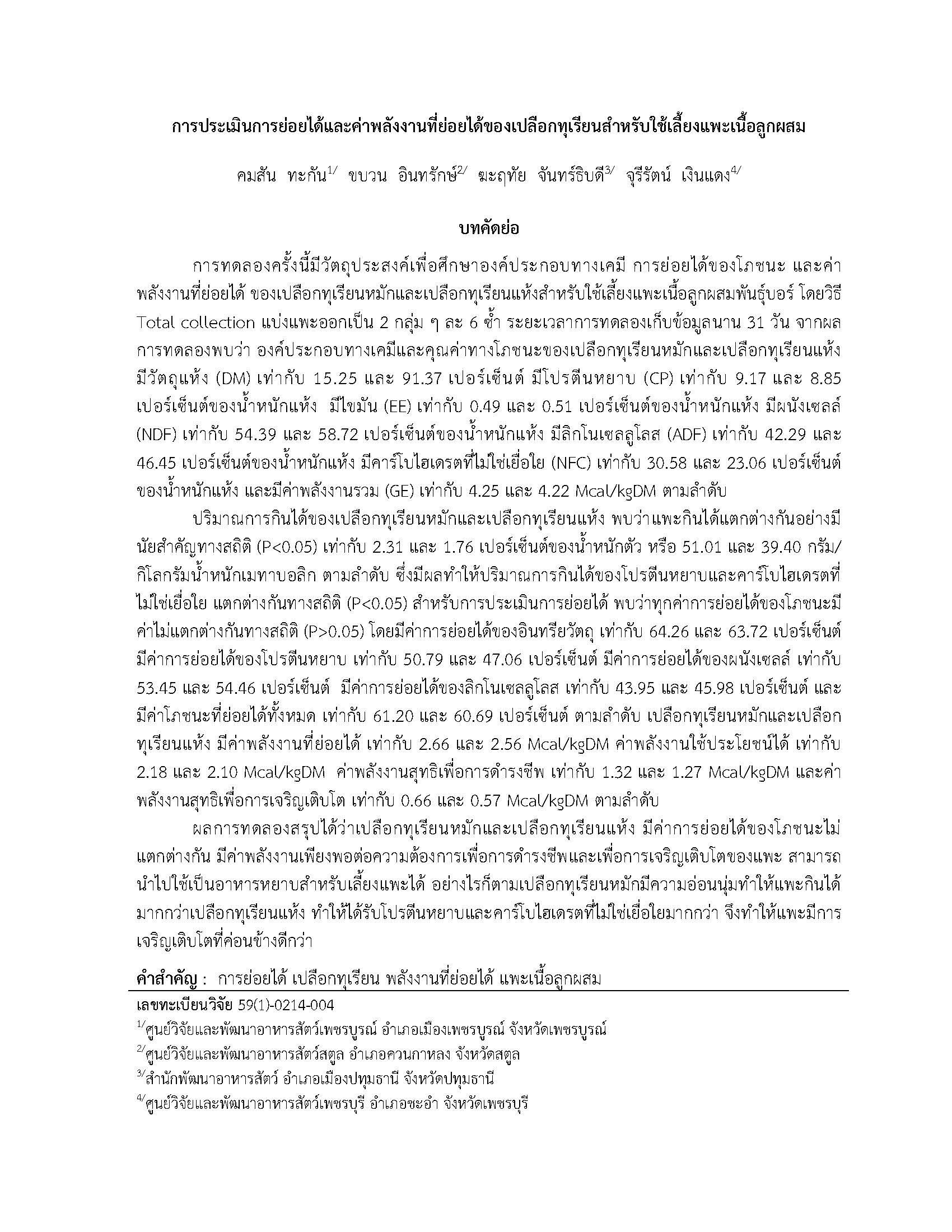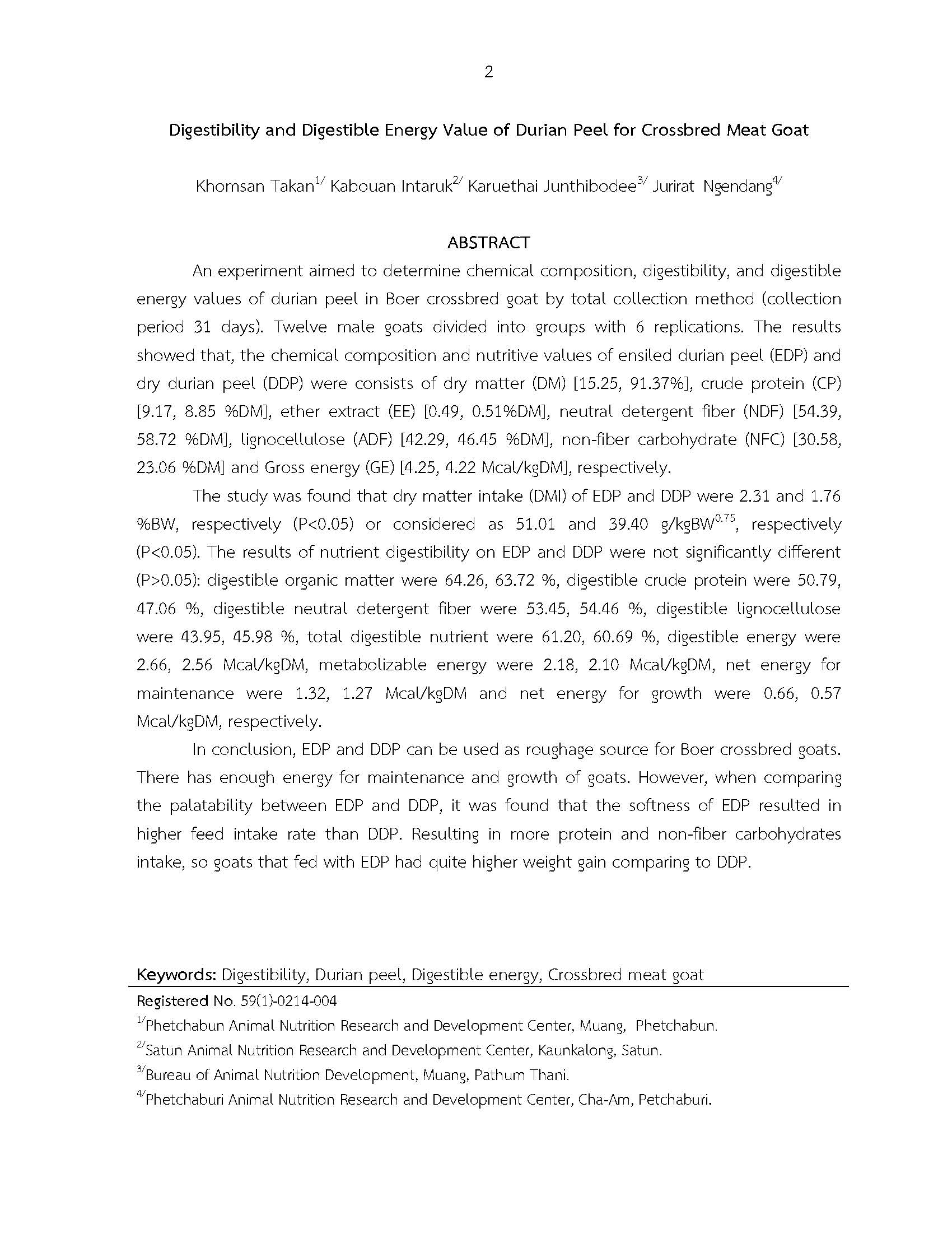 การประเมินการย่อยได้และค่าพลังงานที่ย่อยได้ของเปลือกทุเรียนสำหรับใช้เลี้ยงแพะเนื้้อลูกผสม