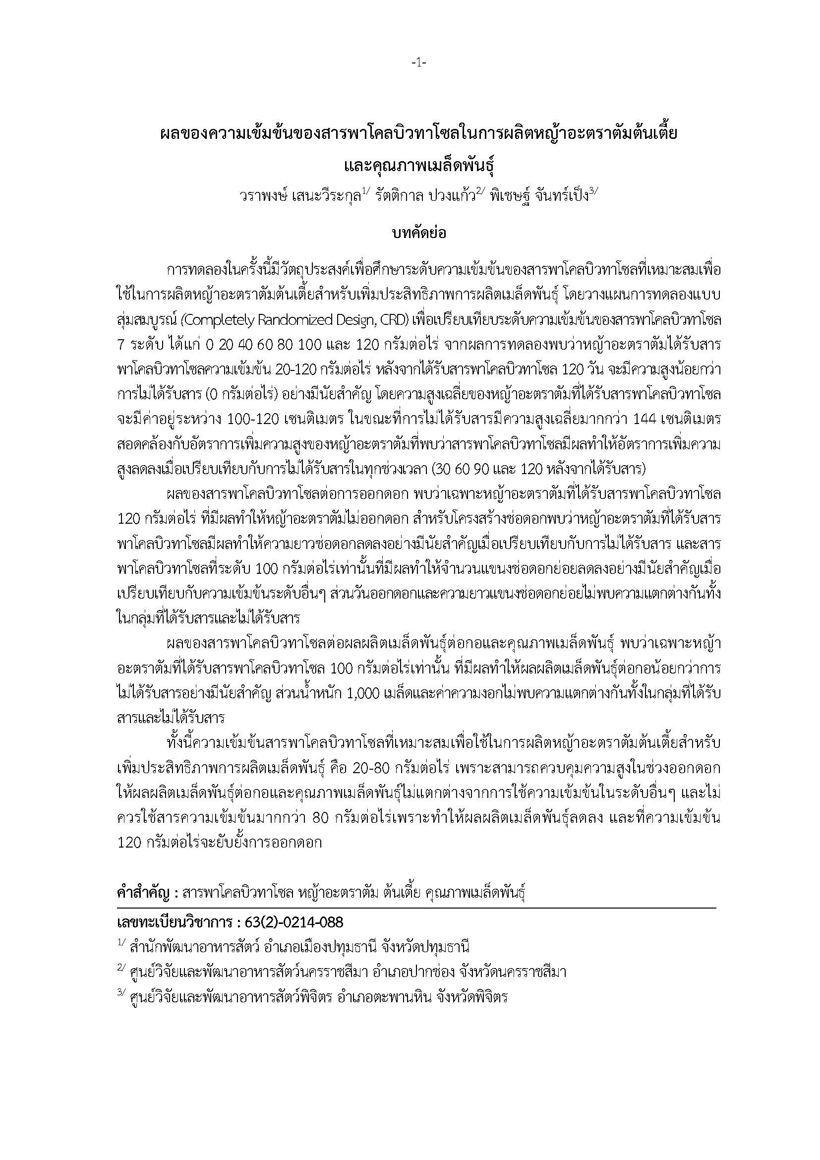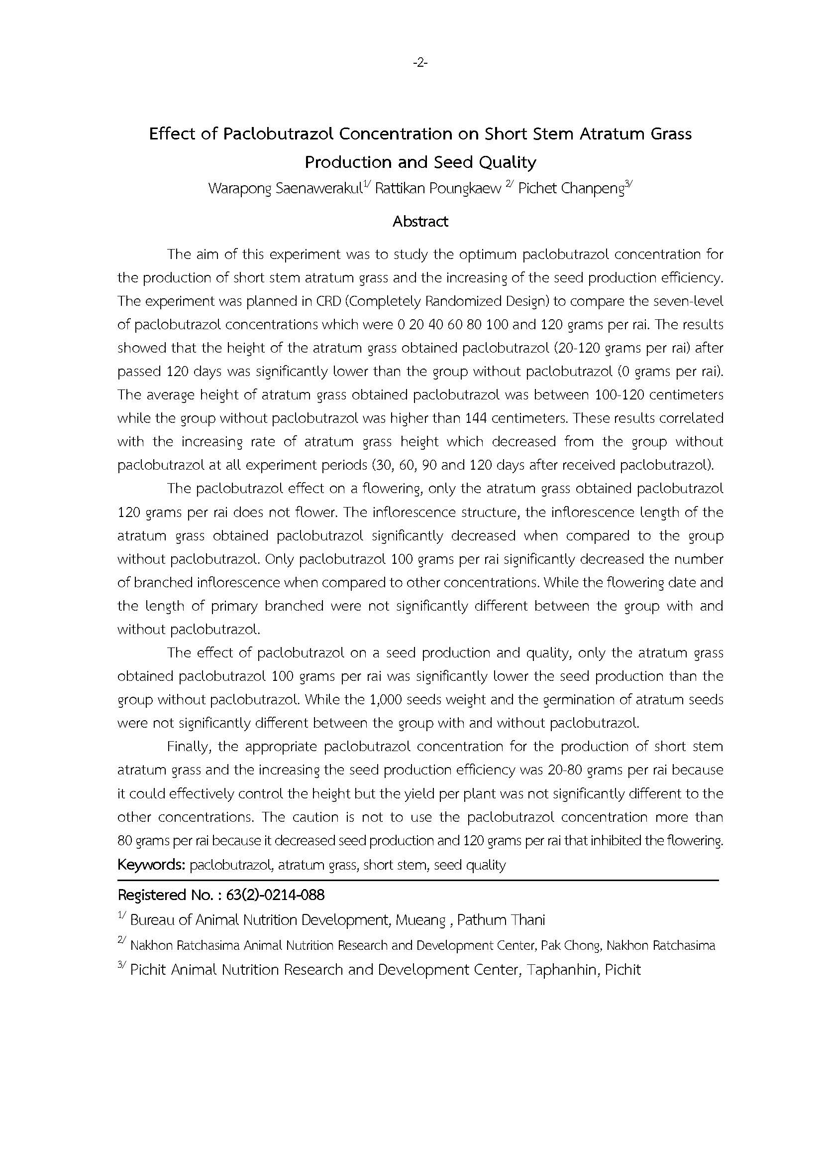 ผลของความเข้มข้นของสารพาโคลบิวทาโซลในการผลิตหญ้าอะตราตัมต้นเตี้ย และคุณภาพเมล็ดพันธุ์ แก้ไขตามมติคณะกรรมการประเมินฯ ในการประชุมครั้งที่ 1/2564 วันที่ 20 ตุลาคม 2563