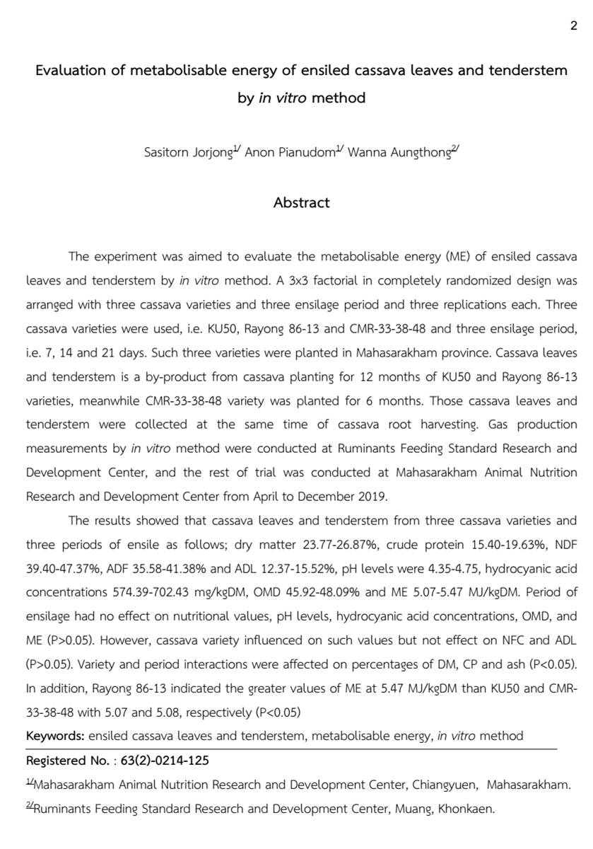 การประเมินค่าพลังงานใช้ประโยชน์ได้ของใบมันสำปะหลังหมักด้วยวิธีทางห้องปฎิบัติการ(ปรับปรุงแก้ไขครั้งที่1)