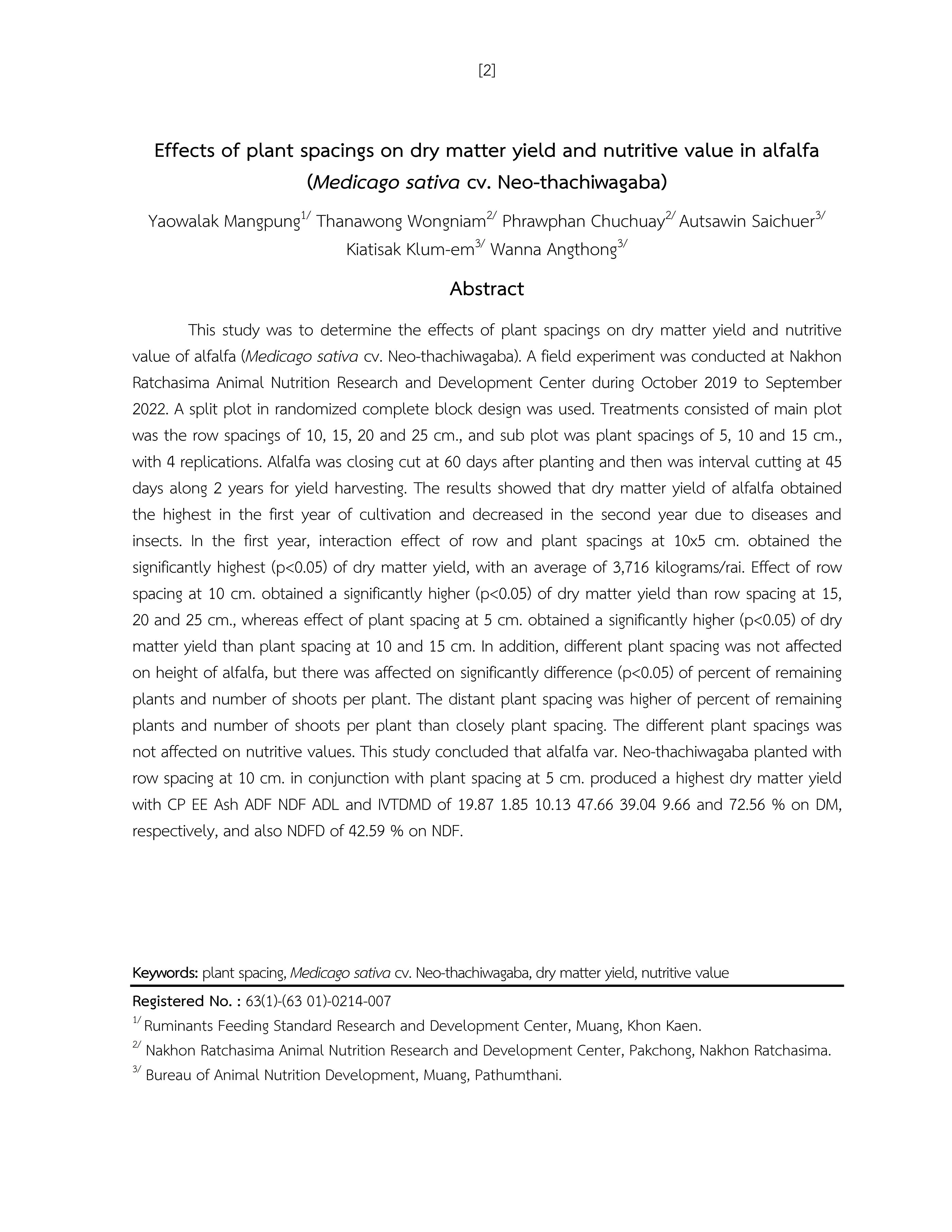 ผลของระยะปลูกที่มีต่อผลผลิตและคุณค่าทางโภชนะของถั่วอัลฟัลฟา สายพันธุ์นีโอทาชิวากาบา