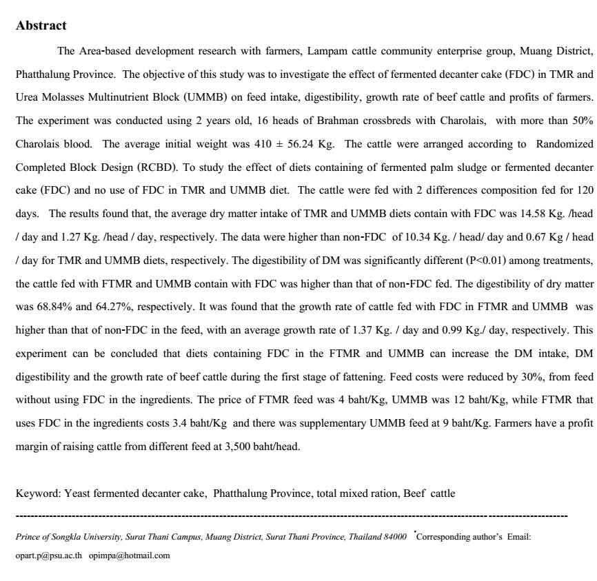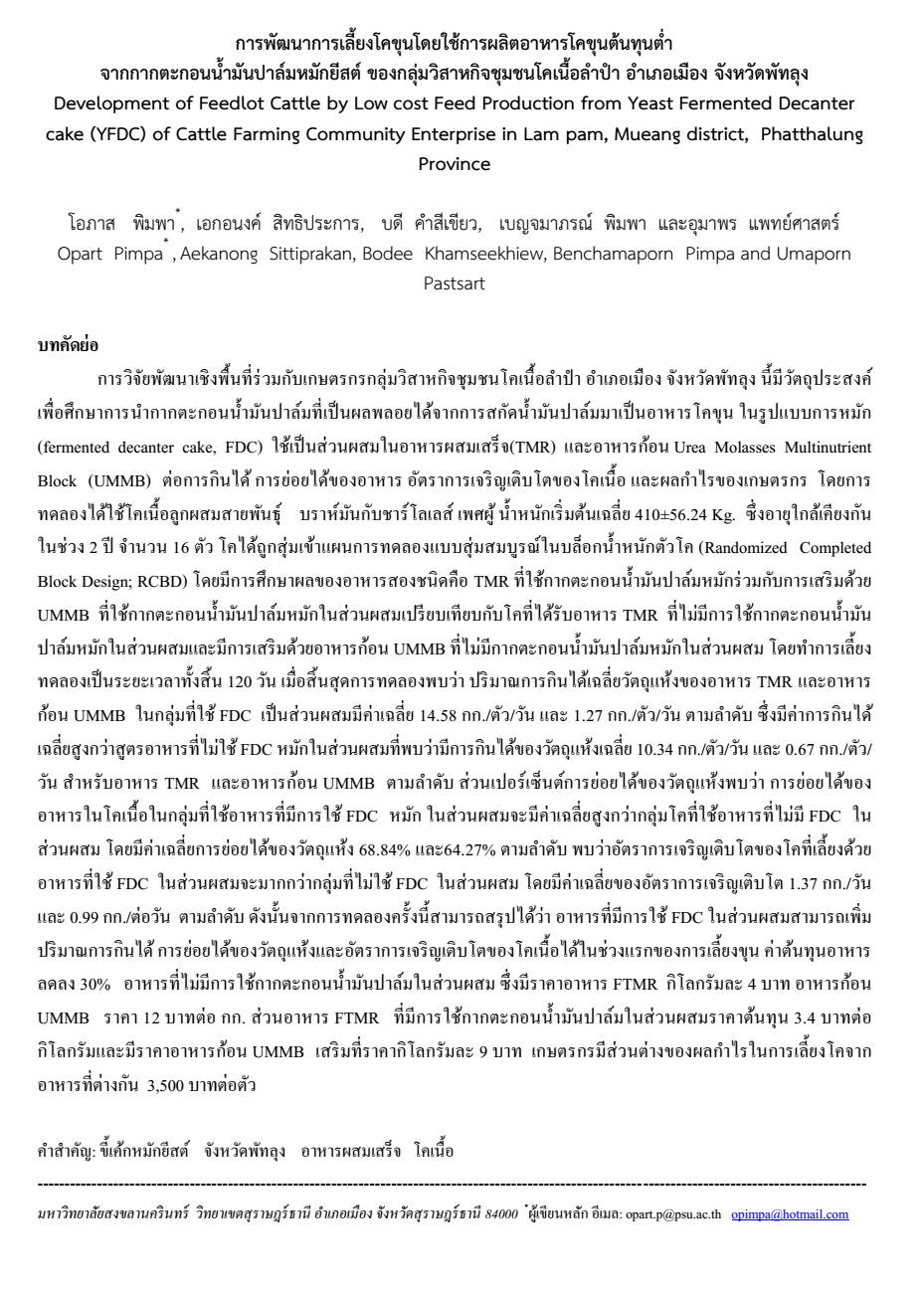 การพัฒนาการเลี้ยงโคขุนโดยใช้การผลิตอาหารโคขุนต้นทุนต่ำ จากกากตะกอนน้ำมันปาล์มหมักยีสต์ ของกลุ่มวิสาหกิจชุมชนโคเนื้อลำปำ อำเภอเมือง จังหวัดพัทลุง