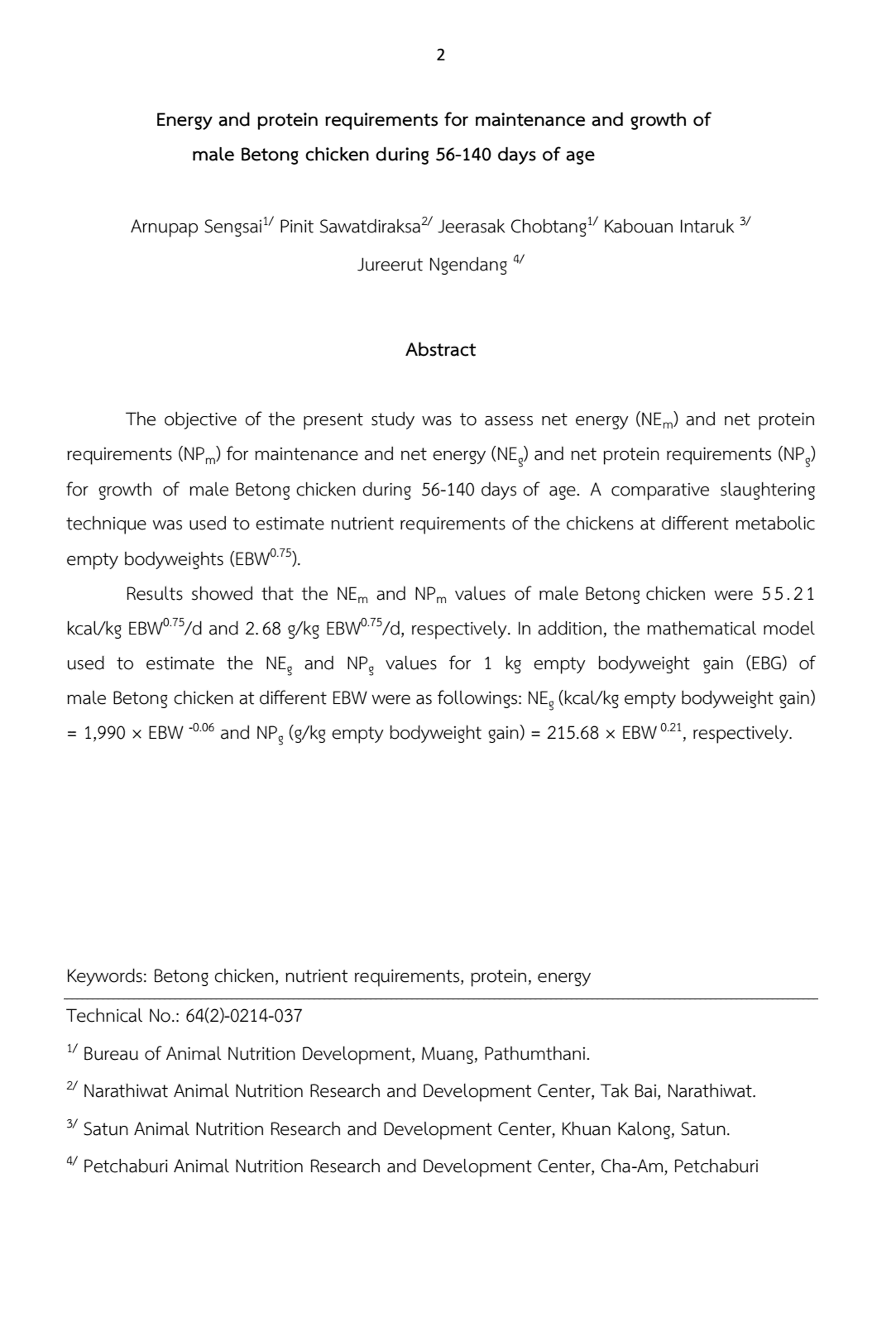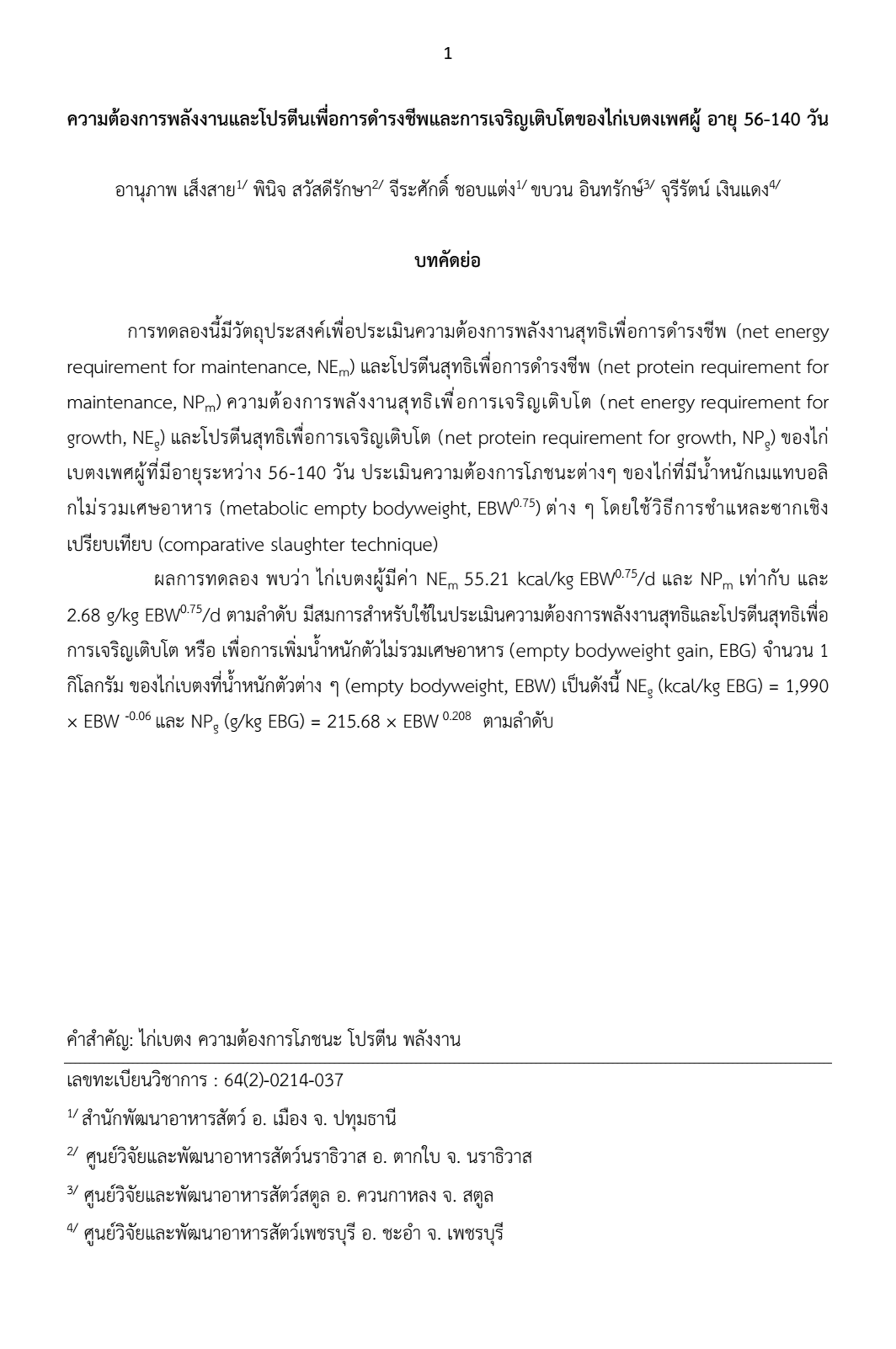ความต้องการพลังงานและโปรตีนเพื่อการดำรงชีพและการเจริญเติบโตของไก่เบตงเพศผู้อายุ 56-140 วัน