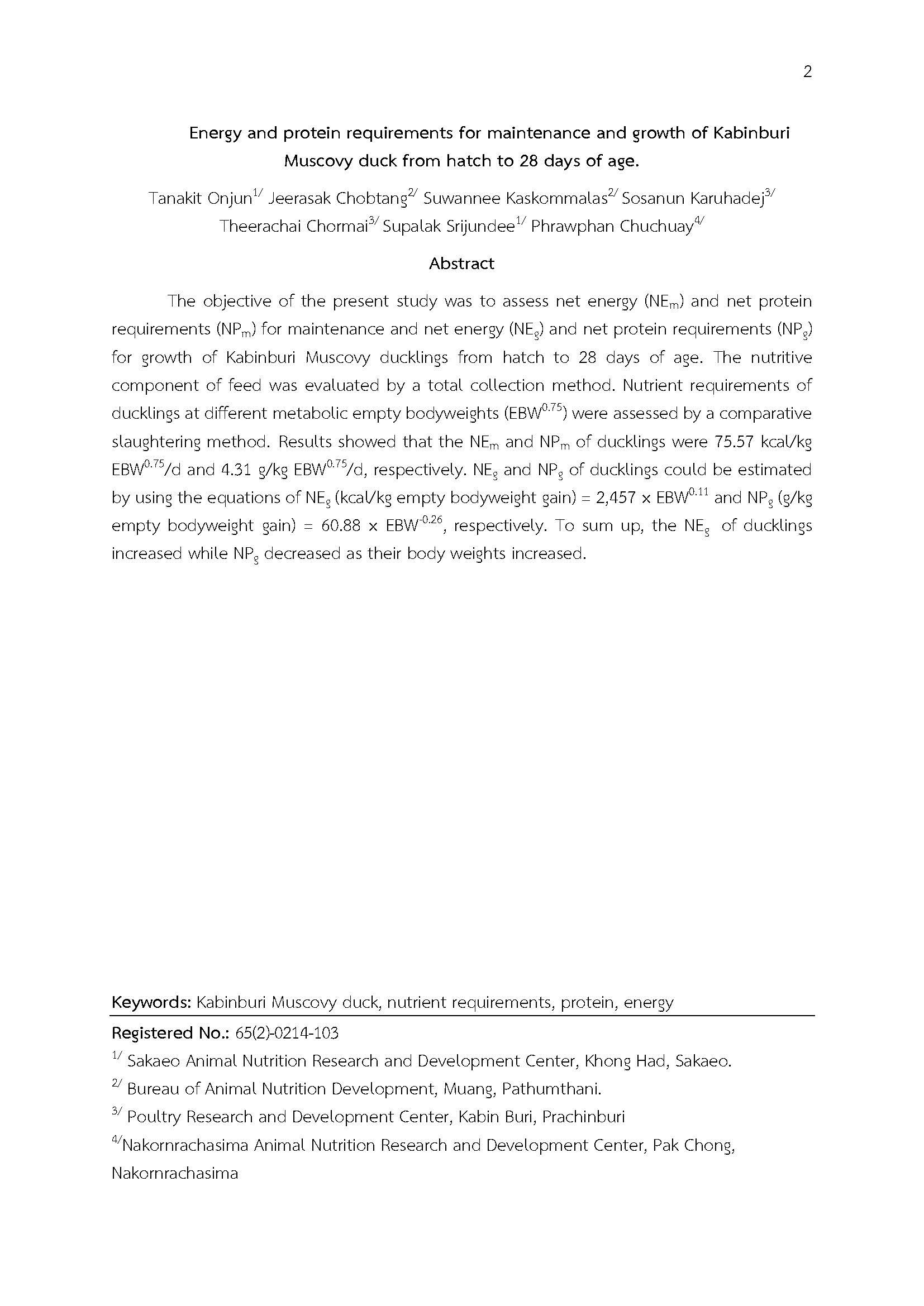 ความต้องการพลังงานและโปรตีนเพื่อการดำรงชีพและการเจริญเติบโตของเป็ดเทศกบินทร์บุรีระยะแรกเกิดถึง 28 วัน