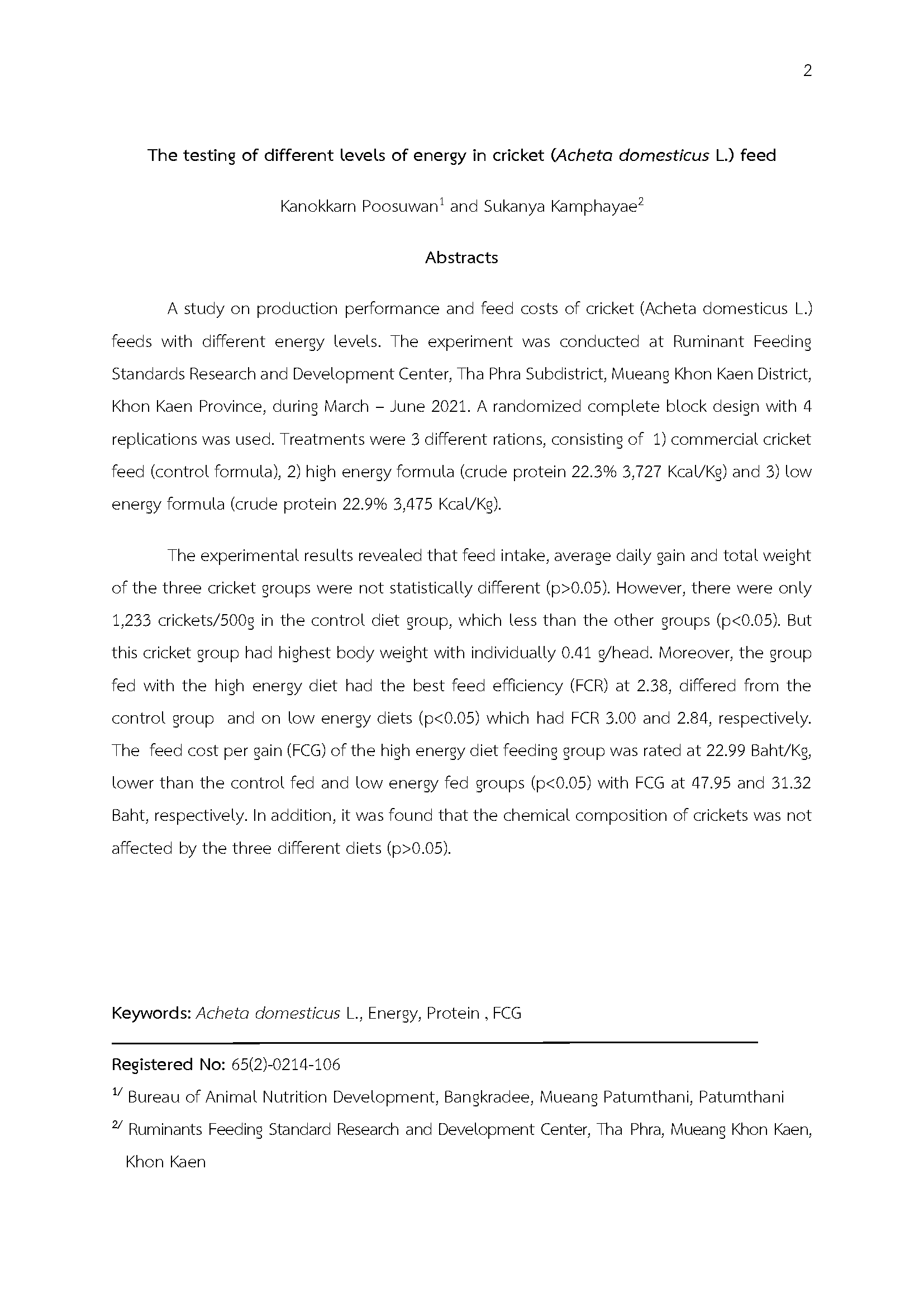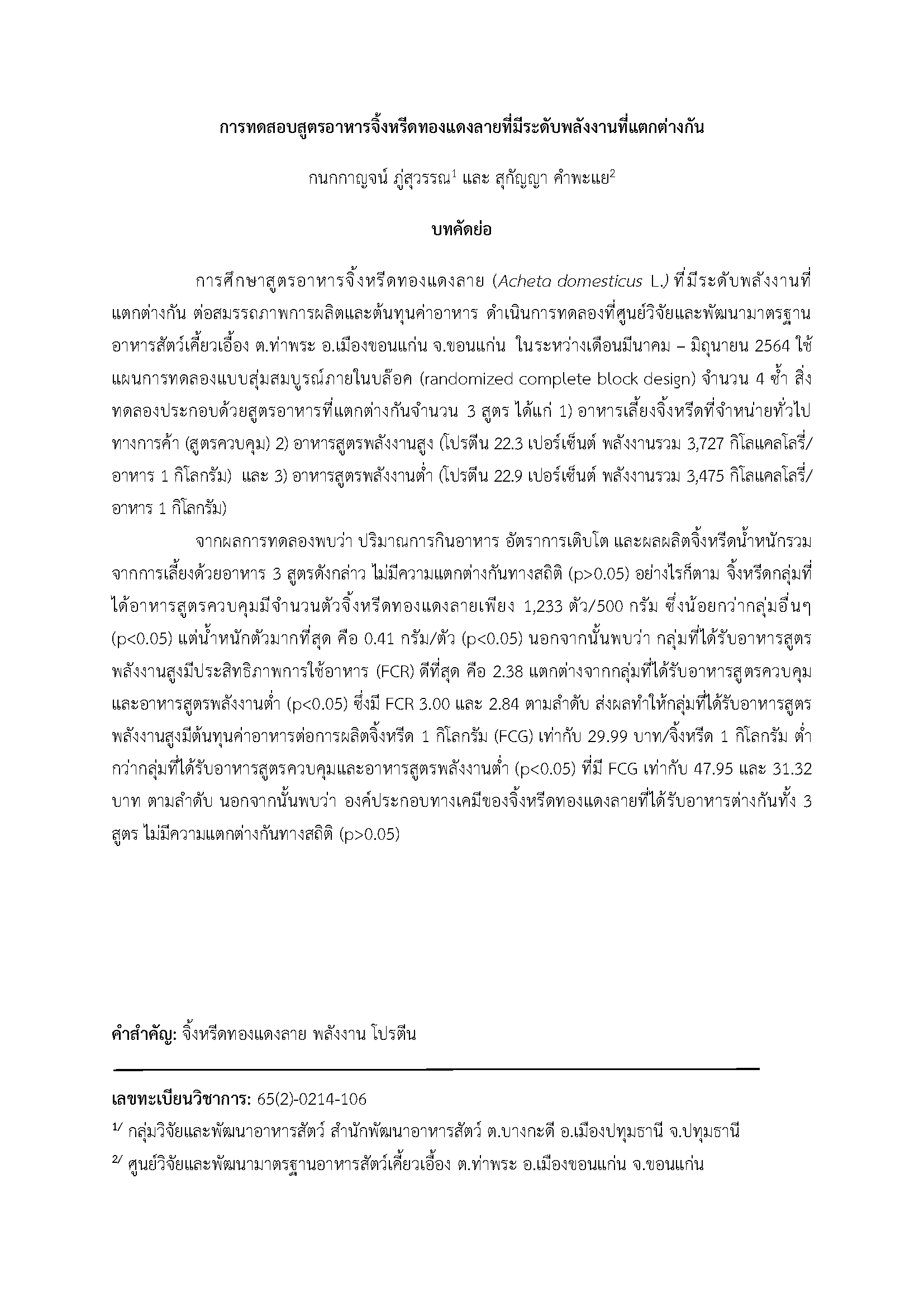 การทดสอบสูตรอาหารจิ้งหรีดทองแดงลายที่มีระดับพลังงานแตกต่างกัน