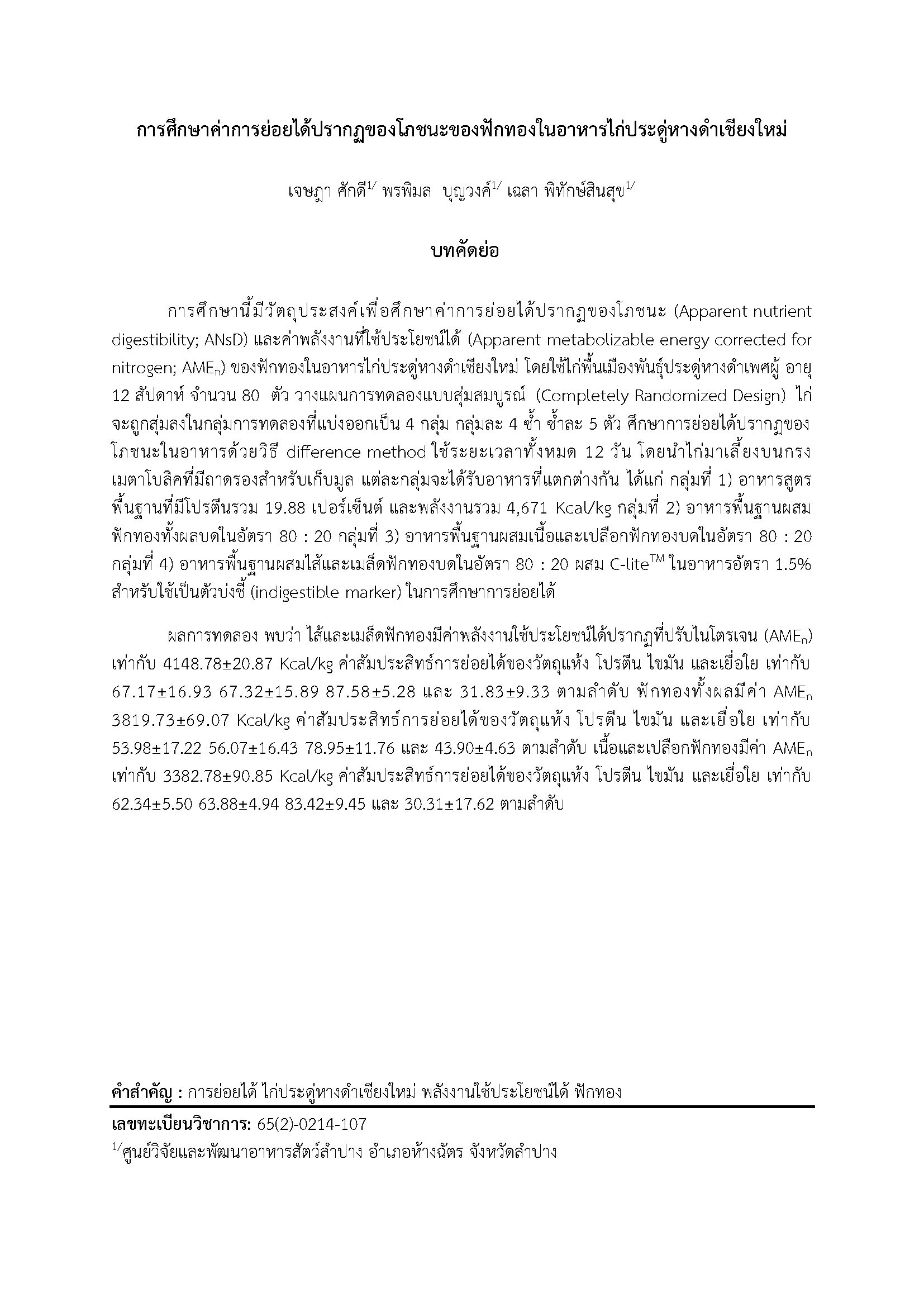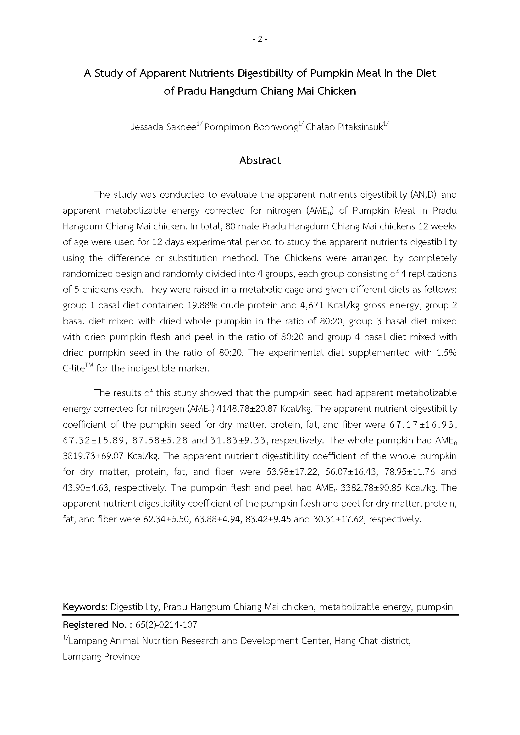 การศึกษาค่าการย่อยได้ปรากฎของโภชนะของฟักทองในอาหารไก่ประดู่หางดำเชียงใหม่