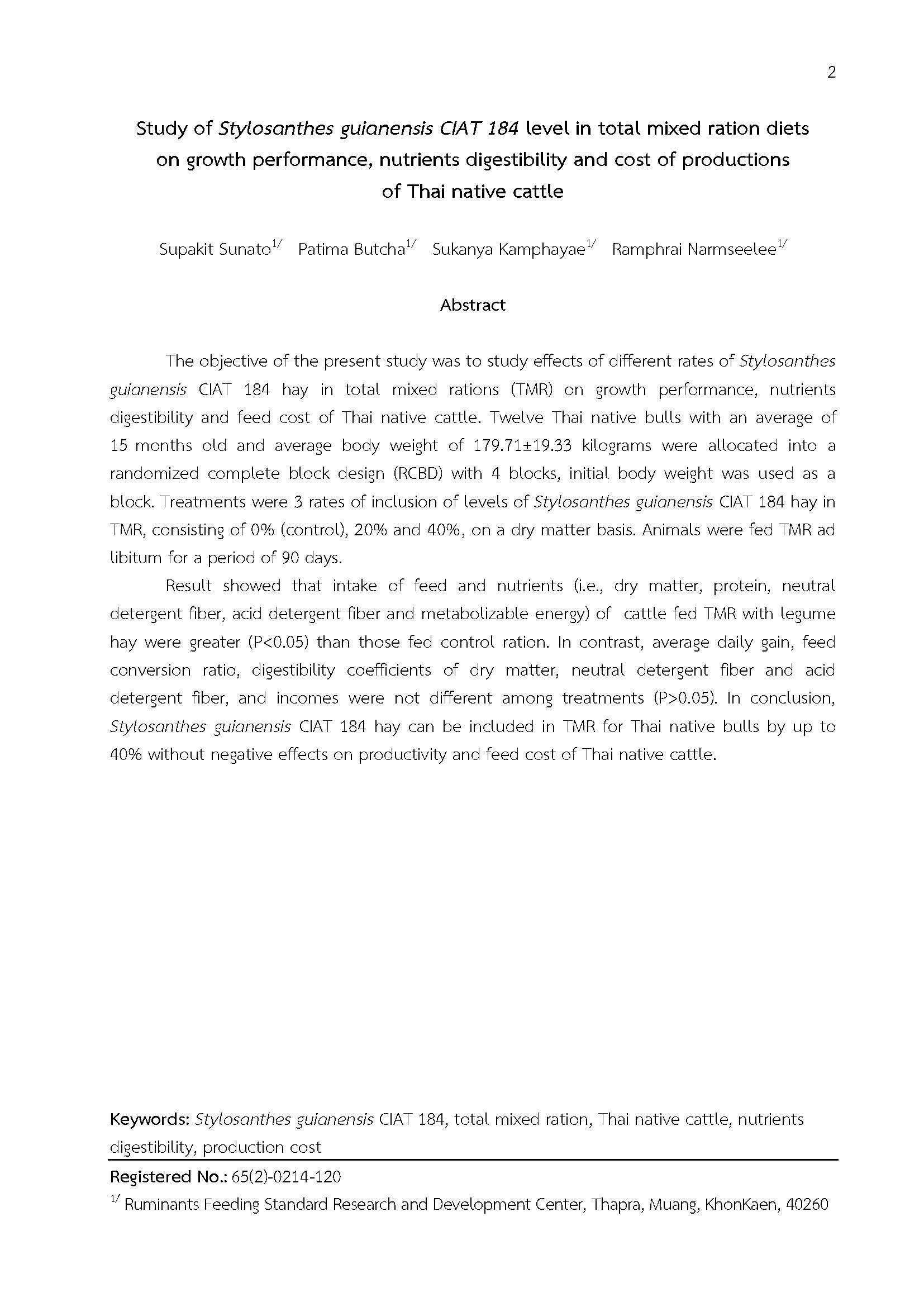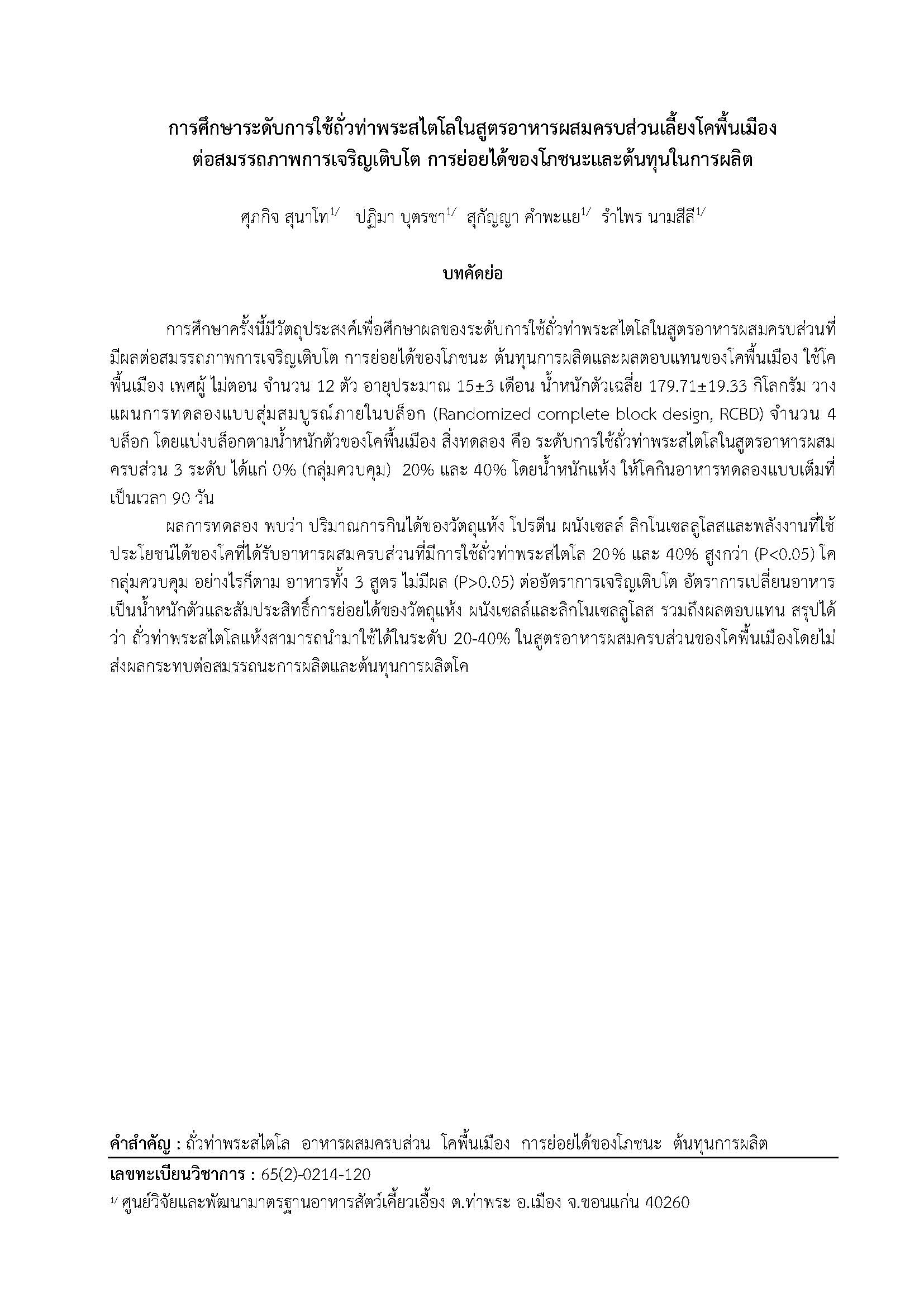 การศึกษาระดับการใช้ถั่วท่าพระสไตโลในสูตรอาหารผสมครบส่วนเลี้ยงโคพื้นเมืองต่อสมรรถภาพการเจริญเติบโต การย่อยได้ของโภชนะและต้นทุนในการผลิต