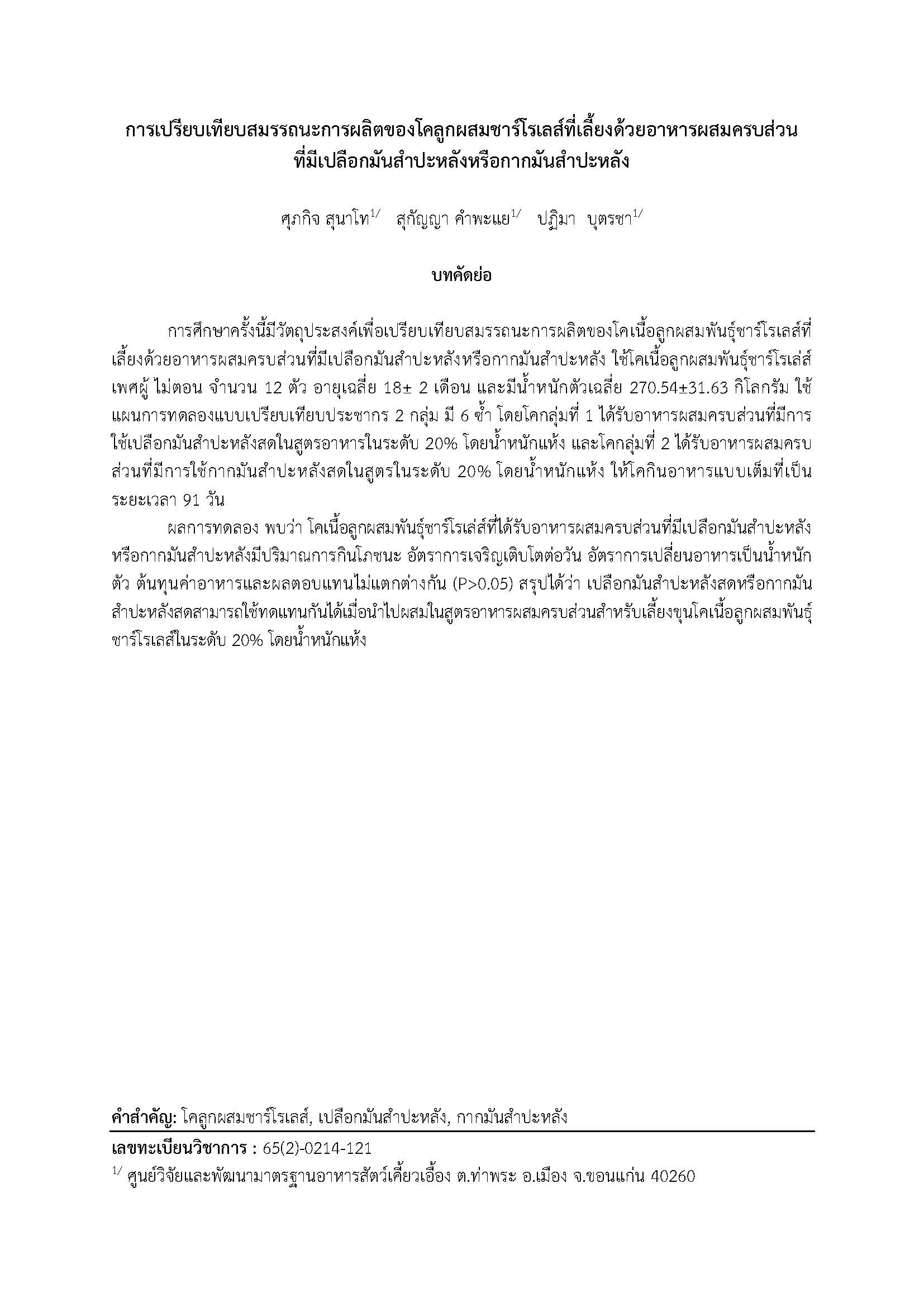 การเปรียบเทียบสมรรถนะการผลิตของโคลูกผสมชาร์โรเลส์ที่เลี้ยงด้วยอาหารผสมครบส่วนที่มีเปลือกมันสำปะหลังหรือกากมันสำปะหลัง