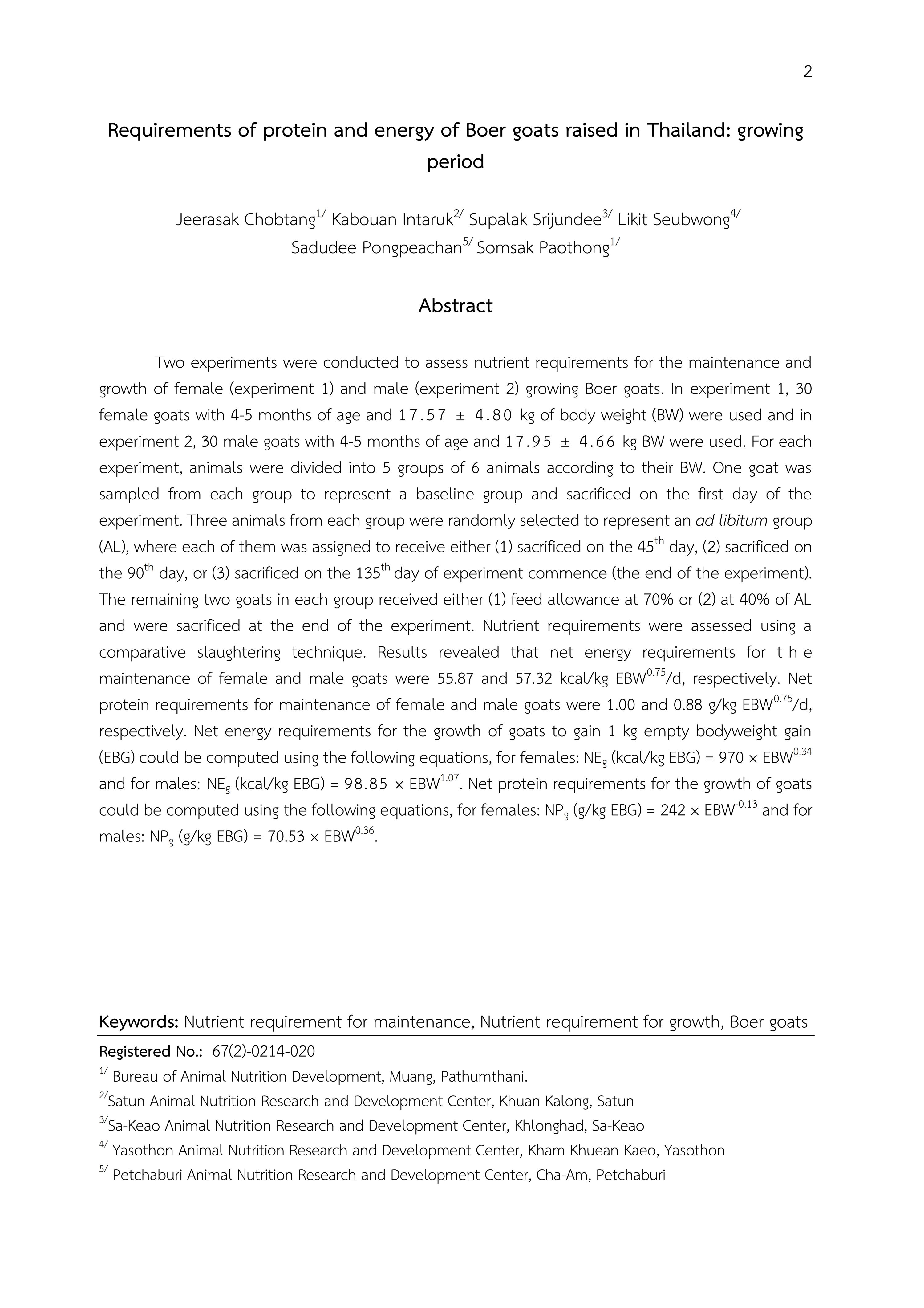 ความต้องการโปรตีนและพลังงานของแพะพันธุ์บอร์ที่เลี้ยงในประเทศไทย : ระยะเจริญเติบโต
