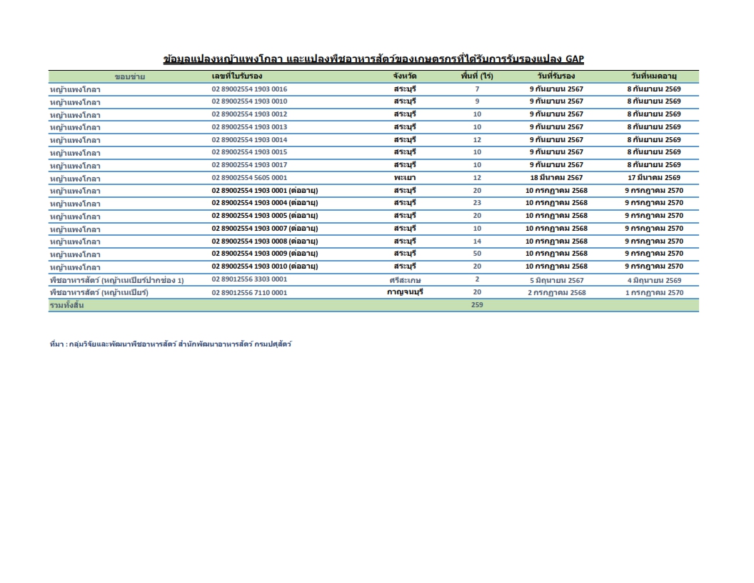 ข้อมูลแปลงหญ้าแพงโกลา และแปลงพืชอาหารสัตว์ของเกษตรกรที่ได้รับการรับรองแปลง GAP