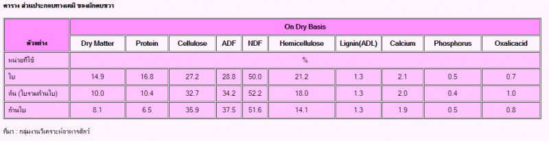 จากการที่กลุ่มงานวิเคราะห์อาหารสัตว์ กองอาหารสัตว์ได้สุ่มเก็บตัวอย่างผักตบชวามาวิเคราะห์ หาคุณค่าทางอาหารพบว่า ต้นผักตบชวาสด (ใบรวมก้านใบ) มีน้ำเป็นส่วนประกอบอยู่สูงถึง 90% มีโปรตีน 1% เถ้า 1.4% และเยื่อใย (NDF) 5.2% จะเห็นได้ว่าต้นผักตบชวาสดมีคุณค่าทางอาหารสัตว์ต่ำ แต่เมื่อนำไปตากแห้งพบว่าคุณภาพจะสูงขึ้น โดยที่ส่วนใบจะมีคุณ ค่าทางอาหารสูงคือ มีโปรตีน 16.8% NDF 50% แต่ก้านใบมีโปรตีนเพียง 6.5% และNDF 51.6% การที่คุณค่าทางอาหารของใบ และก้านใบมีความแตกต่างกัน เช่นนี้ อาจจะเนื่องมาจากใบของพืช มีหน้าที่ในการสังเคราะห์แสงสร้างอาหาร ดังนั้น จึงมีโภชนะต่าง ๆ สะสมอยู่มากกว่าส่วนอื่น